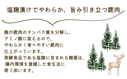 麹が鹿肉のタンパク質を分解しアミノ酸に変えるので、柔らかく食べやすい鹿肉に仕上がっています。発酵食品である塩麹は腸内環境を意識した食生活に寄り添います。