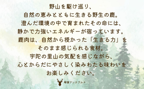 野生の動物は、高い波動を持っていると言われております。それは、自然の物を食べ、野山をかけめぐり、みなぎる生命力をもっているからです。鹿肉は、そのエネルギーを持ち、加工食品に汚染されず、生きる力を感じられる食材です。宇陀の里山の気配を感じながら、心とからだにやさしく染みわたる味わいをお楽しみください。