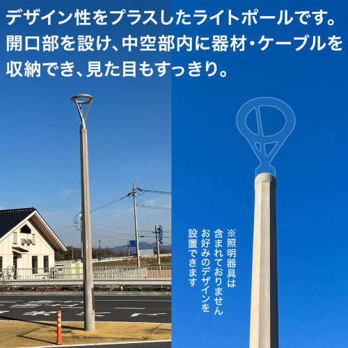 従来のポールにデザイン性を加味したライトポール(LP)です。開口部を設け、中空部内に器材・ケーブルを収納できるので見た目もすっきりしております。