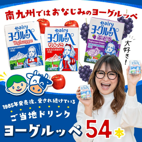 『ヨーグルッペぶどう』は2026年3月2日新発売! 南九州ではおなじみの「ヨーグルッペ」は、1985年の発売以来、小さなお子様からご年配の方まで、幅広い世代の皆様に愛され続けているご当地ドリンクです。 まろやかで甘酸っぱいヨーグルトのような味わいが特長で、そのやさしい口当たりは、とても飲みやすいとご好評いただいております。 定番のヨーグルッペに加え、りんご味、ぶどう味の3種類をセットにしてお届けします。 ☆未開封であれば常温で保管できます。