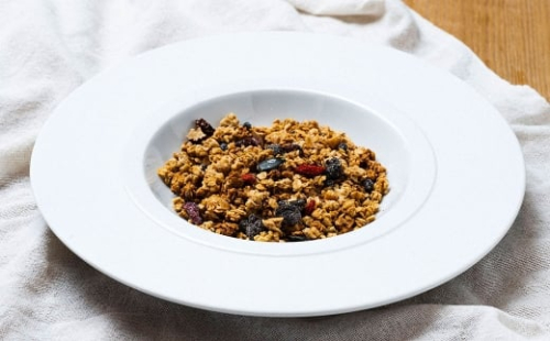 オーガニックのオートミールやナッツ、ドライフルーツを使った自家製グラノーラ。
