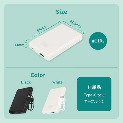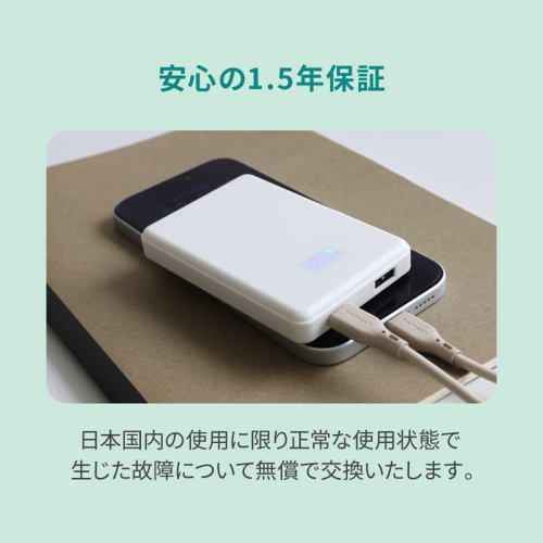 安全性に優れる「準固体電池」を採用した、容量5000mAhのモバイルバッテリーです。コンパクトながら、日常使いのスマートフォン充電に十分な容量を備え、安心して長く使えます。