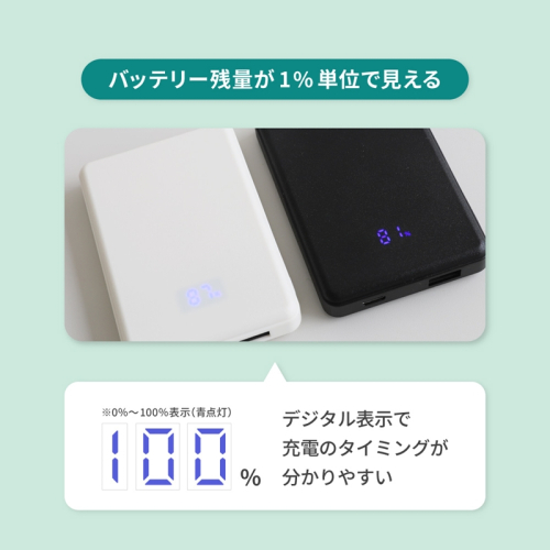 バッテリー残量を1%単位で確認できるデジタル表示を搭載。LEDランプ数の残量表示よりもわかりやすく充電残量を確認できます。