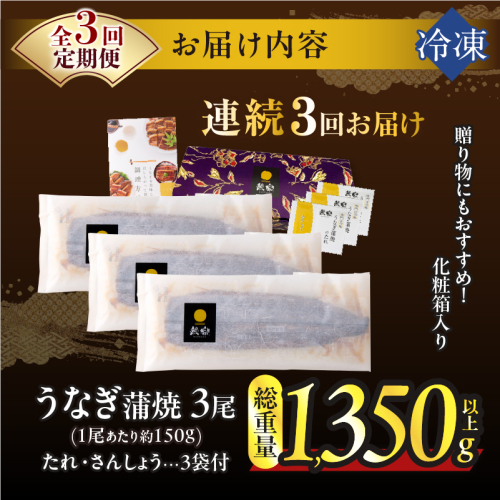 【3回連続定期便】うなぎ蒲焼3尾(さんしょう・たれ付き)総重量1350g以上 鰻 魚 魚介 加工品 国産_T026-0145-R