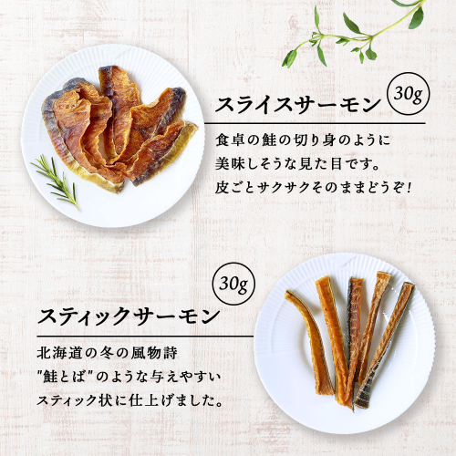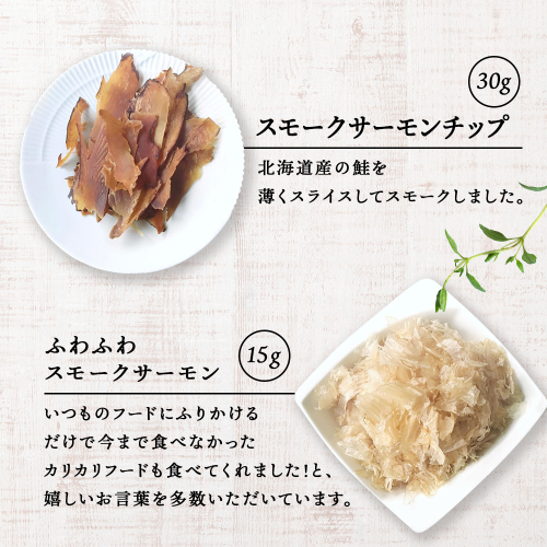 サーモンシリーズ4種類にスモークサーモンチップ、ふわふわスモークサーモンを加えた