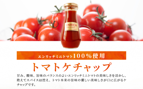 【商品詳細】 甘み、酸味、旨味のバランスのよいエンリッチミニトマトの美味しさを活かし、敢えてスパイスは控え、トマト本来の旨味の優しい美味しさが口に広がるケチャップをお作りしました。 プレーンオムレツにかけていただくと、よりトマトの旨味をケチャップの中に感じていただけます!!  ハンバーグソースやピザソースにアレンジ、ナポリタンを始め鶏肉等をケチャップで炒め物に、「エンリッチミニトマトケチャップ」で様々なお食事を楽しんでください。 【原材料】 ミニトマト(北海道長万部町産)、果糖ぶどう糖液糖、醸造酢、玉ねぎ、食塩、砂糖/香辛料、糊料(グルコマンナン)、(一部に小麦を含む) 【産地】 原産地 北海道長万部町 【保存方法】 暗所で常温保存 開栓後は冷蔵庫にて保存しお早めにお召し上がりください。