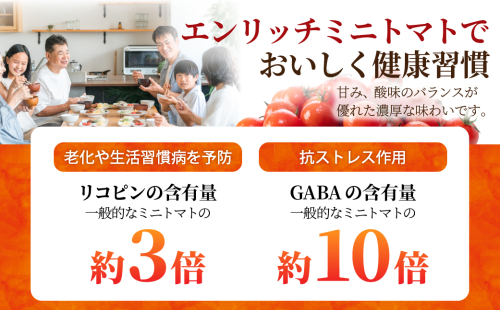 北海道長万部の地にて、天然のミネラルと、理想的な水分、栄養を与え、大切に育てられたエンリッチミニトマトを100%使用。