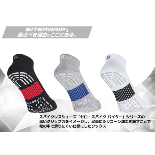 スパイクレスシューズ「ゼロ・スパイク バイター」シリーズの高いグリップ力をイメージし、足裏にシリコーン加工を施すことで靴の中で滑りにくい仕様になっています。