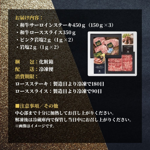 - 和牛サーロインステーキ450g(150g×3)、和牛ローススライス350g、ピンク岩塩2g(1g×2)、岩塩2g(1g×2)