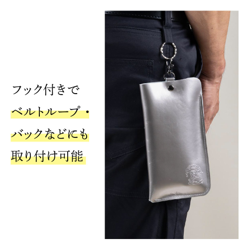レザーケースは、しなやかで丈夫な牛革(本革)を使用しており、スマートフォンケースとしてはもちろん、鍵やイヤホン・筆記用具入れとしても活躍します。フック付きなので、バッグや鍵・ベルトループなどにも取り付けることができ、日常生活の中で気軽に使用いただけます。
