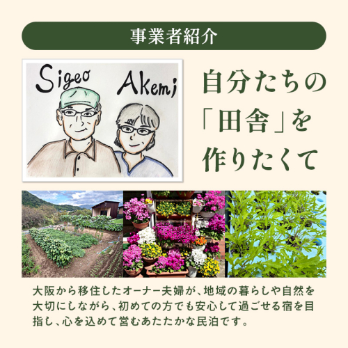 大阪から移住したご夫婦が営む、あたたかな民泊です。
