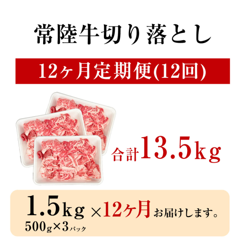 - 【 定期便 12ヶ月 連続 】 常陸牛 切り落とし 1.5kg ( 500g ×3袋 × 12回 ) (茨城県共通返礼品) 使いやすい パック A4 A5 ランク 黒毛和牛 国産黒毛和牛 和牛 国産 牛肉 牛 お肉 肉 ひたち牛 小分け [CD106sa]