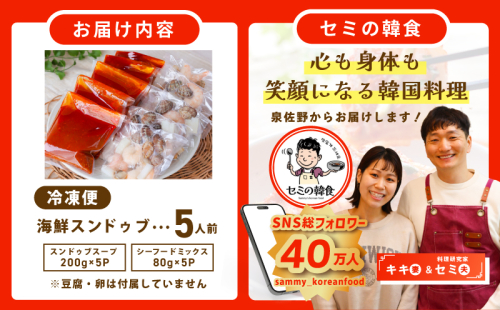 - スンドゥブスープ200g×5、シーフードミックス(海老、アサリ、いか)80g×5※豆腐、卵なし