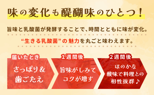 旨味と乳酸菌が発酵することで、時間とともに味が変化。