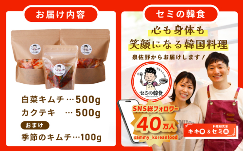 - 白菜キムチ(500g)、カクテキ(500g)、おまけ季節のキムチ(100g)