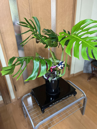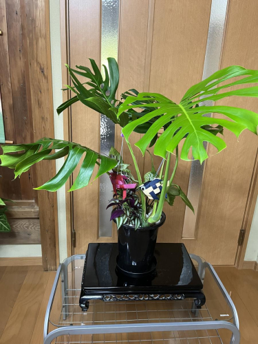 モンステラ3~4本立ちに人気のシンゴニューム・シマムラサキツユクサ2種を寄せ植えました!!