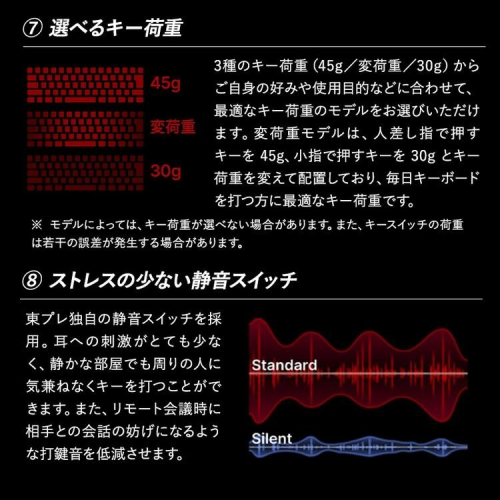 ・東プレスイッチと呼ばれる物理的な接点が無い静電容量無接点方式のキースイッチを搭載し、優れた信頼性と耐久性を実現