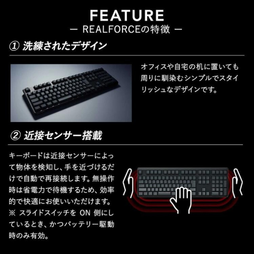・東プレスイッチと呼ばれる物理的な接点が無い静電容量無接点方式のキースイッチを搭載し、優れた信頼性と耐久性を実現
