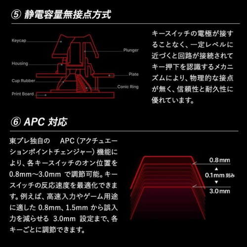 ・東プレ独自の APC機能により、各キースイッチのオン位置を調節でき、キースイッチの反応速度を最適化可能