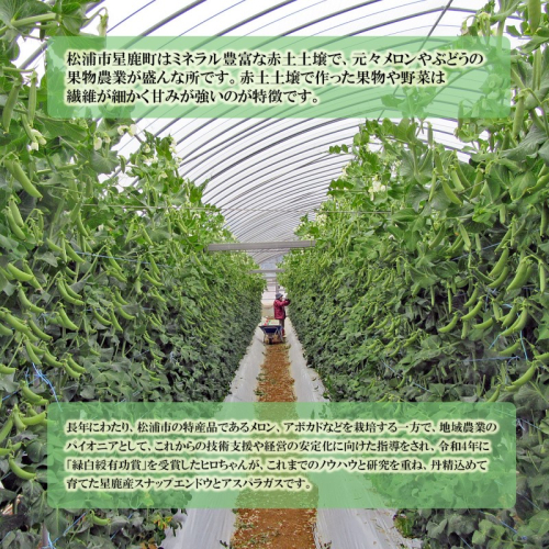 長年にわたり、松浦市の特産物であるメロン、アボカドなどを栽培する一方で、地域農業のパイオニアとしてこれらの技術支援や経営の安定化に向けた指導をされ、令和4年度に「緑白綬有功章」を受章された川上さん(ヒロちゃん)が、これまでのノウハウと研究を重ね、丹精込めて育てた星鹿産スナップエンドウとアスパラガスです。
