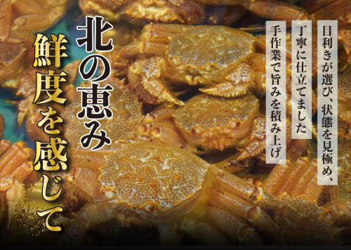 北海道を中心に、国内の北の海で水揚げされた毛ガニを、その時季に最も状態のよいものから選定しています。原料は広く北の海から見極めますが、浜ゆで後の加工、身出し、甲羅への盛り付け、急速冷凍までの主要工程はすべて町内で行い、本返礼品として完成させています。