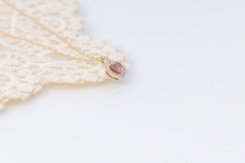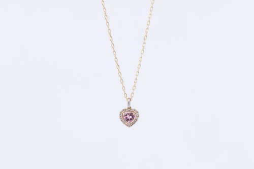 可憐なハートシェイプのピンクトルマリンを、繊細なダイヤモンドが華やかに取り巻くネックレス。