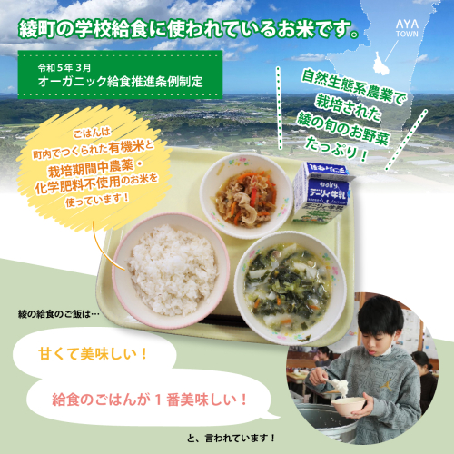 ユネスコエコパークに登録された綾町で、自然生態系農業を実践する8名の生産者が心を込めて育てたお米です。 綾町では令和5年に全国に先駆けて綾町オーガニック給食推進条例を制定し、学校給食へオーガニックな米、野菜を安定的に供給できる体制づくりに取り組んでいます。 農薬・除草剤を使用せず栽培しており、環境にやさしくおいしく食べられるお米です。 国が推進するスマート農業にも挑戦しており、アイガモロボットや紙マルチなどを活用して除草の省力化を目指し効率的な農業の追求も実践しております。 数には限りがありますのでお早めにご注文ください。 【地場産品に該当する理由】 当該地方団体の区域内において生産されたものであること。〈告示第五条第一号に該当〉