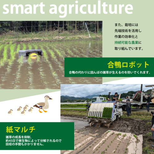 国が推進するスマート農業にも挑戦しており、アイガモロボットや紙マルチなどを活用して除草の省力化を目指し効率的な農業の追求も実践しております。