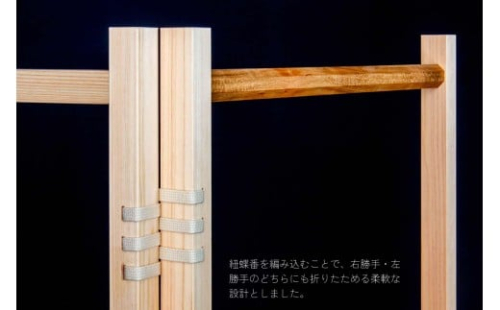 国産檜と山桜を用い、建具職人が伝統的なホゾ組みで丁寧に仕上げた衣類ラックです。 紐蝶番を編み込むことで、右勝手・左勝手のどちらにも折りたためる柔軟な設計としました。 片面には吉原オリジナル「もみじ」の組子を配し、葉が舞い落ちる情景を表現。 やさしい木の気配が暮らしに寄り添い、空間にほどよい存在感をもたらす“魅せるラック”です。 【地場産品類型番号|理由】 3|浜田市内で材の加工から組み立てまでの一連の工程を行っているため。 【提供企業】 有限会社 吉原木工所 TEL:0855-34-0227