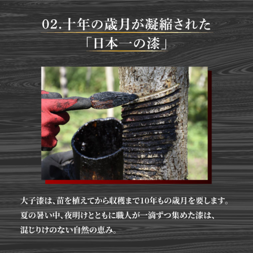 良質の大子漆をふんだんに使用し、漆掻きから木次加工、漆塗りまで一貫した製作を心がけております。