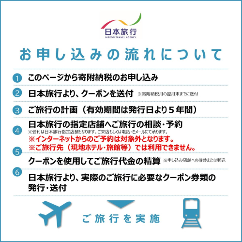 [対象者]原則寄附者ご本人様 [予約・利用方法]株式会社日本旅行の指定店舗(利用案内に記載の店舗)にて予約・精算 ※当クーポンはご旅行先(現地ホテル等)で直接ご利用いただくことはできません [キャンセル規定]クーポン自体のキャンセル及び返品は不可。 ご旅行についてはご契約の旅行条件書に準ずる