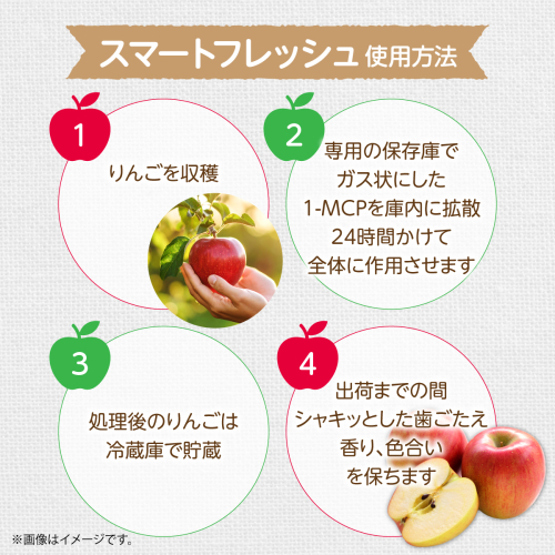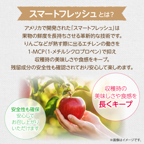 アメリカで開発された「りんご」などの果物専用の鮮度保持技術です。りんごが完熟するのに伴って「エチレン」というガスがりんご本体から生成されます。エチレンは、りんごの成熟を促す大事なガスですが、同時に果実の老化も進めてしまいます。スマートフレッシュは、「1-MCP(1-メチルシクロプロペン)がりんごに作用し、エチレンの働きを抑えることで収穫したときの美味しさを長くキープしてくれる効果がありますが、果実に残留しないため、人体への健康上の心配はありません。