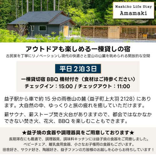 - サウナ付ヴィラ ペア宿泊券 Mashiko Life Stay Amamaki 平日限定 素泊まり 2泊3日 | 一棟貸し 薪サウナ 薪ストーブ BBQ 花火 ヴィラ リゾート 古民家 (DX003)