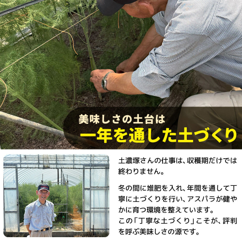 手間を惜しまず育てられたアスパラは、穂先まで鮮やかな緑色が美しく食欲をそそります!
