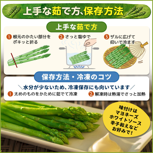 ▼上手な茹で方、保存方法 根元のかたい部分をポキっと折れるところから切り取り、さっと塩ゆでし、ザルに広げて仰いで冷まして下さい。