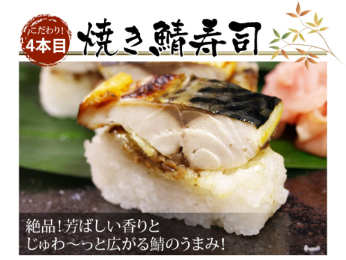 当店の中でも人気の鯖寿司、鱧寿司、太刀魚寿司、焼き鯖寿司 の4種類が半本(4切れ)ずつ