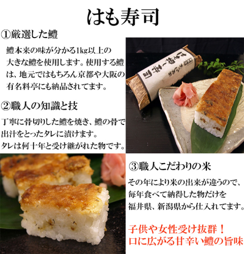 当店の中でも人気のはも寿司(ハモ寿司/鱧寿司)、あなご寿司(穴子寿司)、あゆ寿司(アユ/鮎) の3種類が合計3本セットです。