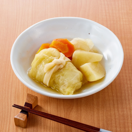 【原材料】野菜(たまねぎ、にんじん、じゃがいも)、ロールキャベツ(中国産)、かつお節だし、しょうゆ、本みりん、たん白加水分解物、食塩/調味料(核酸、アミノ酸)、漂白剤(二酸化硫黄)、(一部に小麦・大豆・豚肉含む)