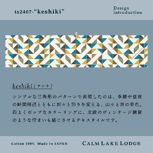 汗をかいたら「拭う」。日差しや寒さが気になったら「纏う」。「テヌグイストール」は、日本手ぬぐいの機能性をヒントに、より乾きやすい素材、より扱いやすい長さに改良。さらに首巻きや乾燥に便利な独自ストラップを追加。お出かけやアウトドア、軽作業や体温調整等、四季を通じ様々なシーンで大活躍します。いきものや自然をモチーフにしたオリジナルプリント(デザイナー描き下ろし)も魅力的。 性別年齢も選ばず、長く愛着を持って使用できるユニークなマルチユーステキスタイルです。 Size:約25cm×120cm / 重量:26g [DESIGN紹介] ts2407 "keshiki" (ケシキ) シンプルな三角形のパターンで表現したのは、季節や昼夜の時間経過とともに刻々と彩りを変える、山々と湖の景色。 程よくポップなカラーリングに、北欧のヴィンテージ雑貨のような佇まいも感じさせるテキスタイルです。 【原材料】 素材:Cotton 100% (抗菌/制菌加工) 【製造地】 富士河口湖町にて企画-デザイン-縫製を行っています
