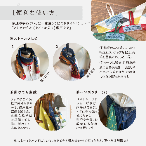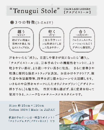汗をかいたら「拭う」。日差しや寒さが気になったら「纏う」。「テヌグイストール」は、日本手ぬぐいの機能性をヒントに、より乾きやすい素材、より扱いやすい長さに改良。さらに首巻きや乾燥に便利な独自ストラップを追加。お出かけやアウトドア、軽作業や体温調整等、四季を通じ様々なシーンで大活躍します。いきものや自然をモチーフにしたオリジナルプリント(デザイナー描き下ろし)も魅力的。 性別年齢も選ばず、長く愛着を持って使用できるユニークなマルチユーステキスタイルです。