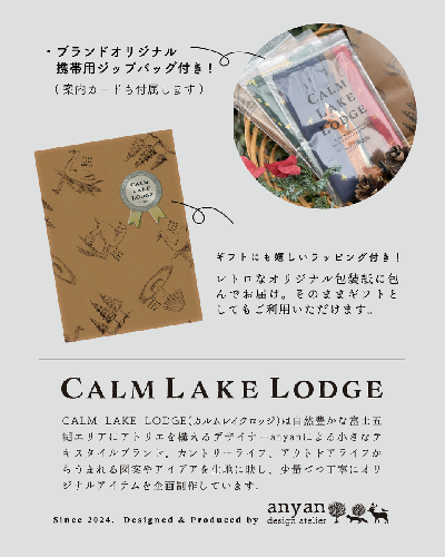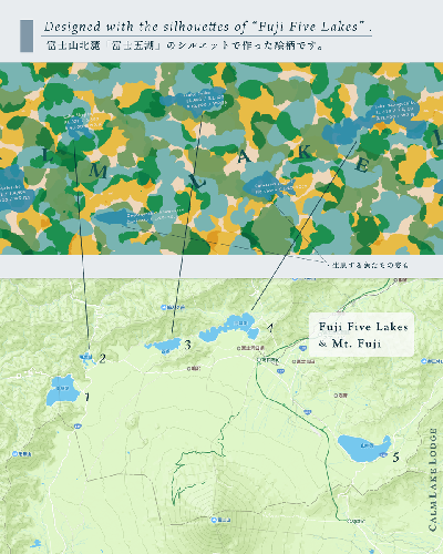 実はその中にはブランドの地元「富士五湖」の五つの湖(標高、面積、外周、水深の情報付き)と、そこに生息する魚たちのフォルムが散りばめられています。