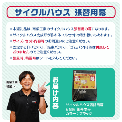 ※本返礼品は、南榮工業のサイクルハウス2台用の張替用の後幕になります。