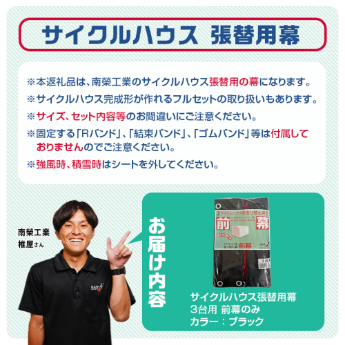 ※本返礼品は、南榮工業のサイクルハウス3台用の張替用の前幕になります。