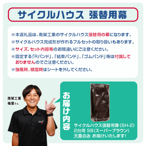 ※本返礼品は、南榮工業のサイクルハウス2台用〈SH-2〉の張替用の天幕になります。