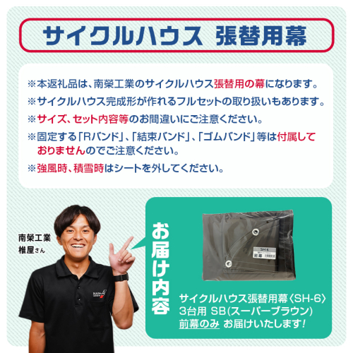 ※本返礼品は、南榮工業のサイクルハウス3台用〈SH-6〉の張替用の前幕になります。