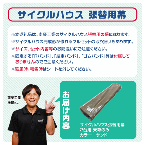 ※本返礼品は、南榮工業のサイクルハウス2台用の張替用の天幕になります。