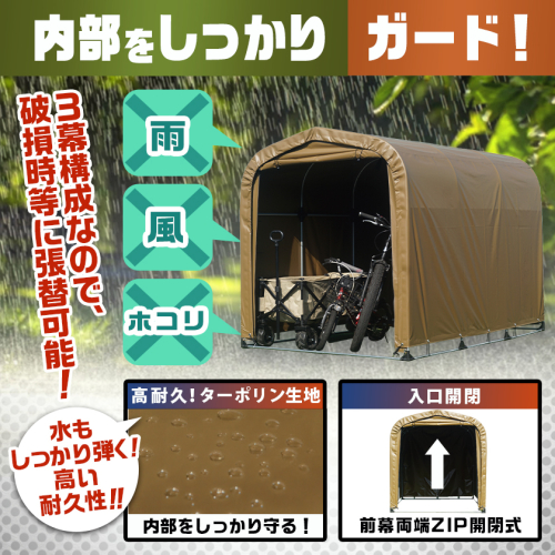 パイプ車庫の実績と性能をそのままサイクルハウスに応用しました。自転車やバイクはもちろん、お子様の乗り物やおもちゃの収納、ガーデニング用品の収納にもとても便利なサイクルハウスの張替用の後幕です。