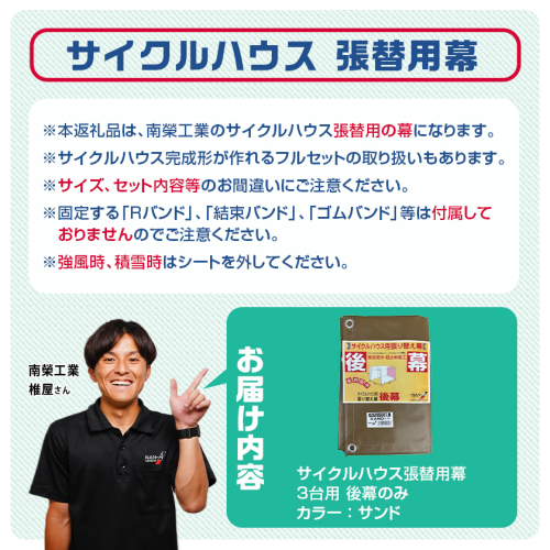 ※本返礼品は、南榮工業のサイクルハウス3台用の張替用の後幕になります。