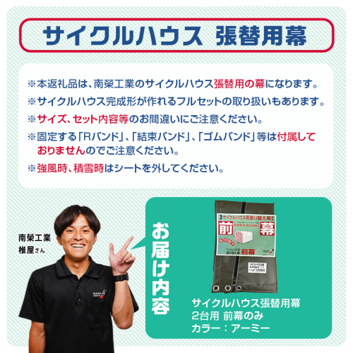 ※本返礼品は、南榮工業のサイクルハウス2台用の張替用の前幕になります。