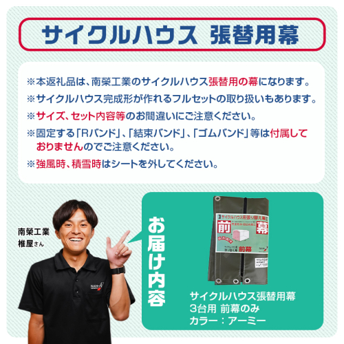 ※本返礼品は、南榮工業のサイクルハウス3台用の張替用の前幕になります。